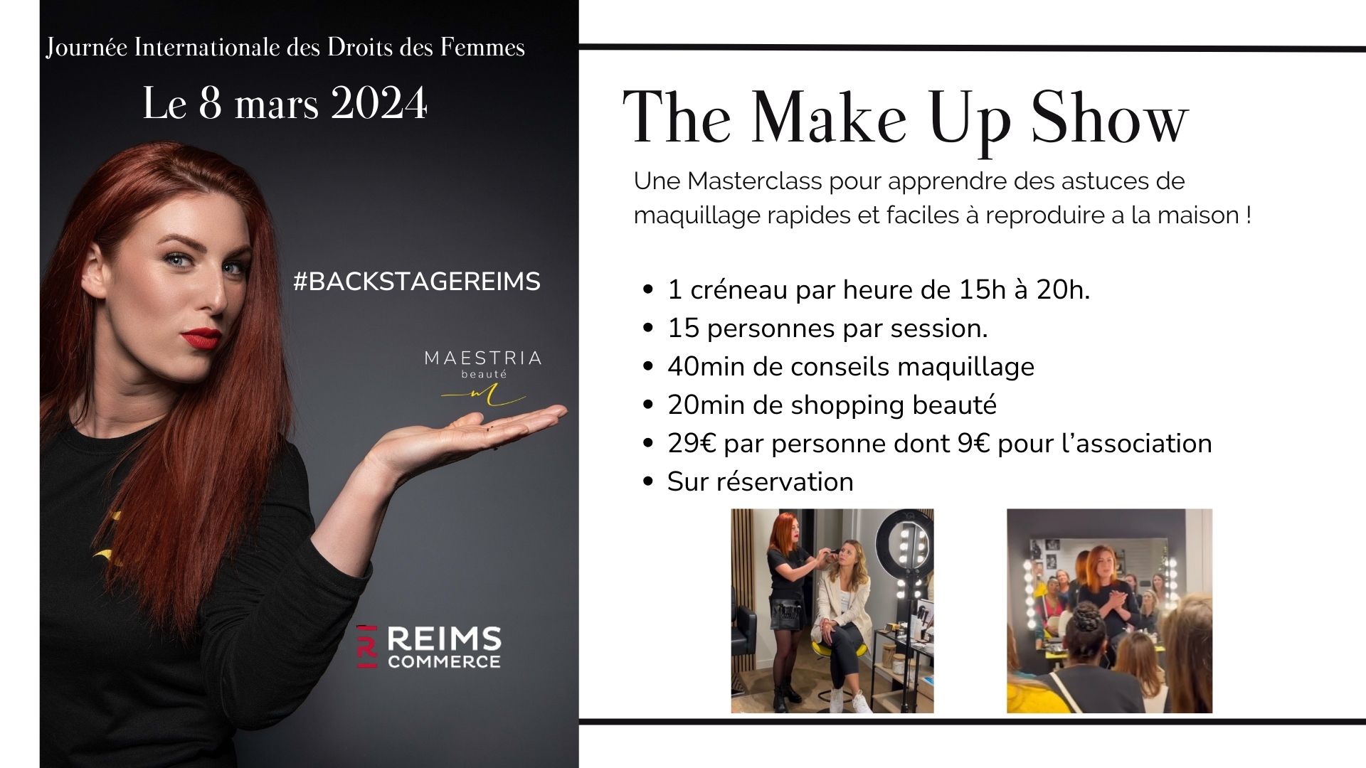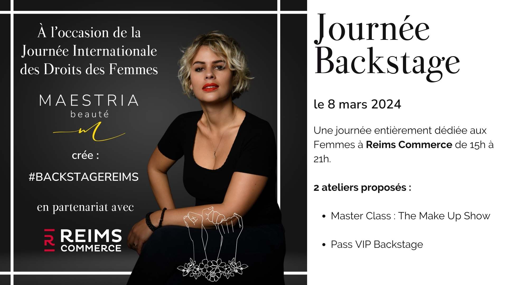 Maestria Beauté organise la Journée #BACKSTAGEREIMS le 8 mars pour la Journée Internationale des Droits des Femmes. Un évènement beauté pour mettre en valeur les Femmes. Vous aurez la possibilité d’assister à la Master Class « The Make Up Show » et/ou réserver un pass VIP pour être maquillée, coiffée et photographiée en studio comme une vraie star ! Pour chaque réservation une partie du montant sera reversé à l’association « La Maison des Femmes 51 » qui lutte contre les violences faites aux femmes. Vous faites donc une bonne action tout en vous faisant plaisir !